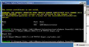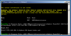 After the install completes launch the PowerCLI shortcut created on the desktop (If you are using Windows 7 you will need to right click on the shortcut and select run as administrator) and enter the following to get rid of the error on the first launch so you will be able to use the cmdlets. “Set-ExecutionPolicy RemoteSigned”