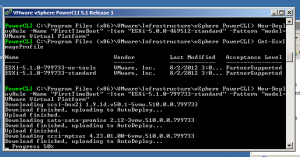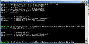 Now run the following command New-DeployRule –Name “FirstTimeBoot” --Item “ESXi-5.1.0-799733-standard” –Pattern “model=VMware Virtual Platform”